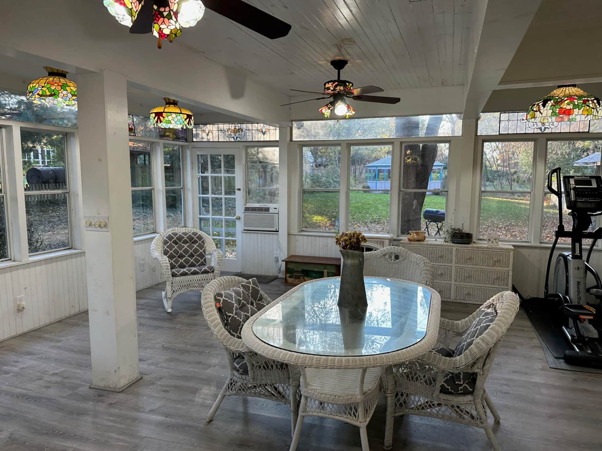 Charmingly accented room with antiques, copious windows and stained glass ceiling fan.